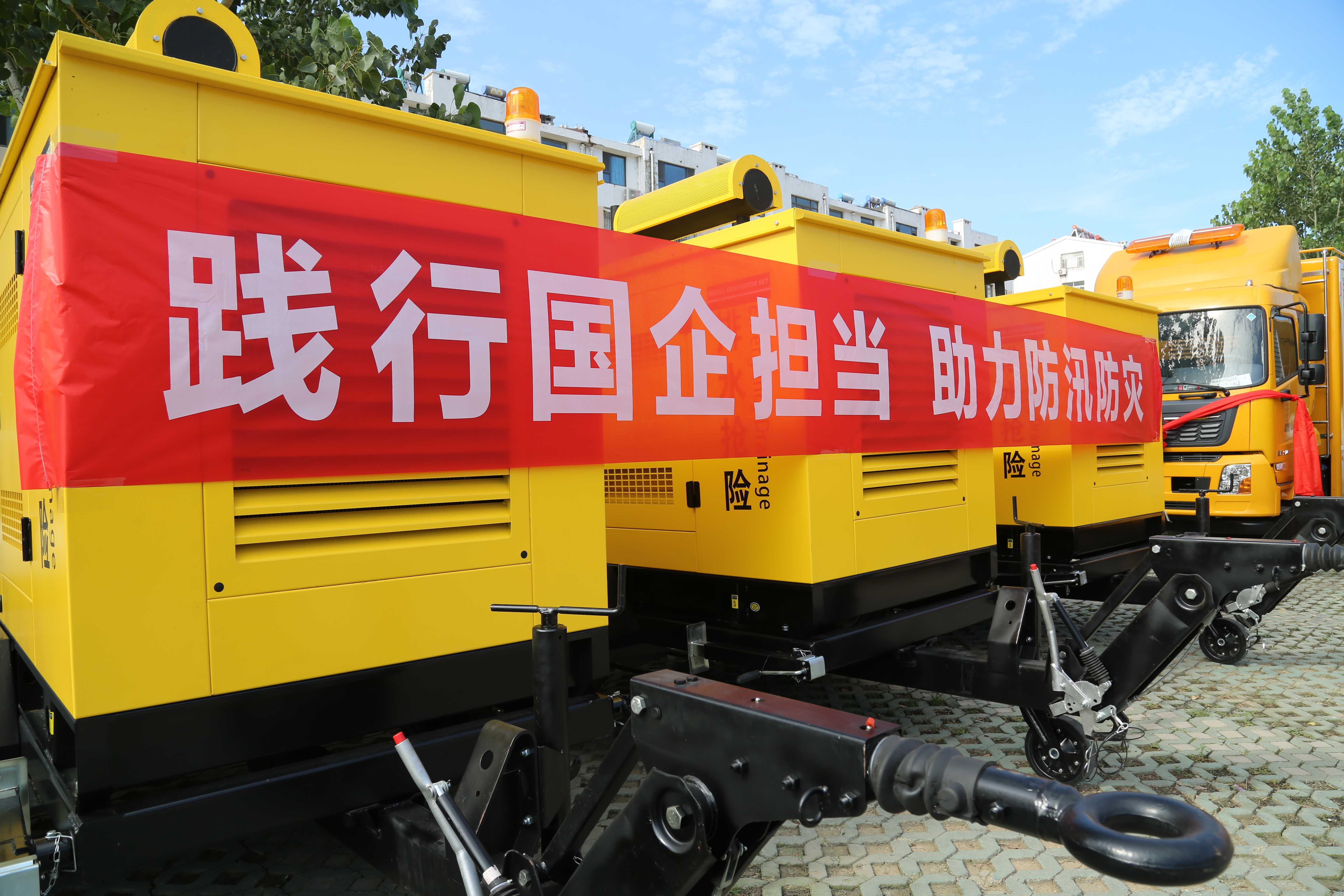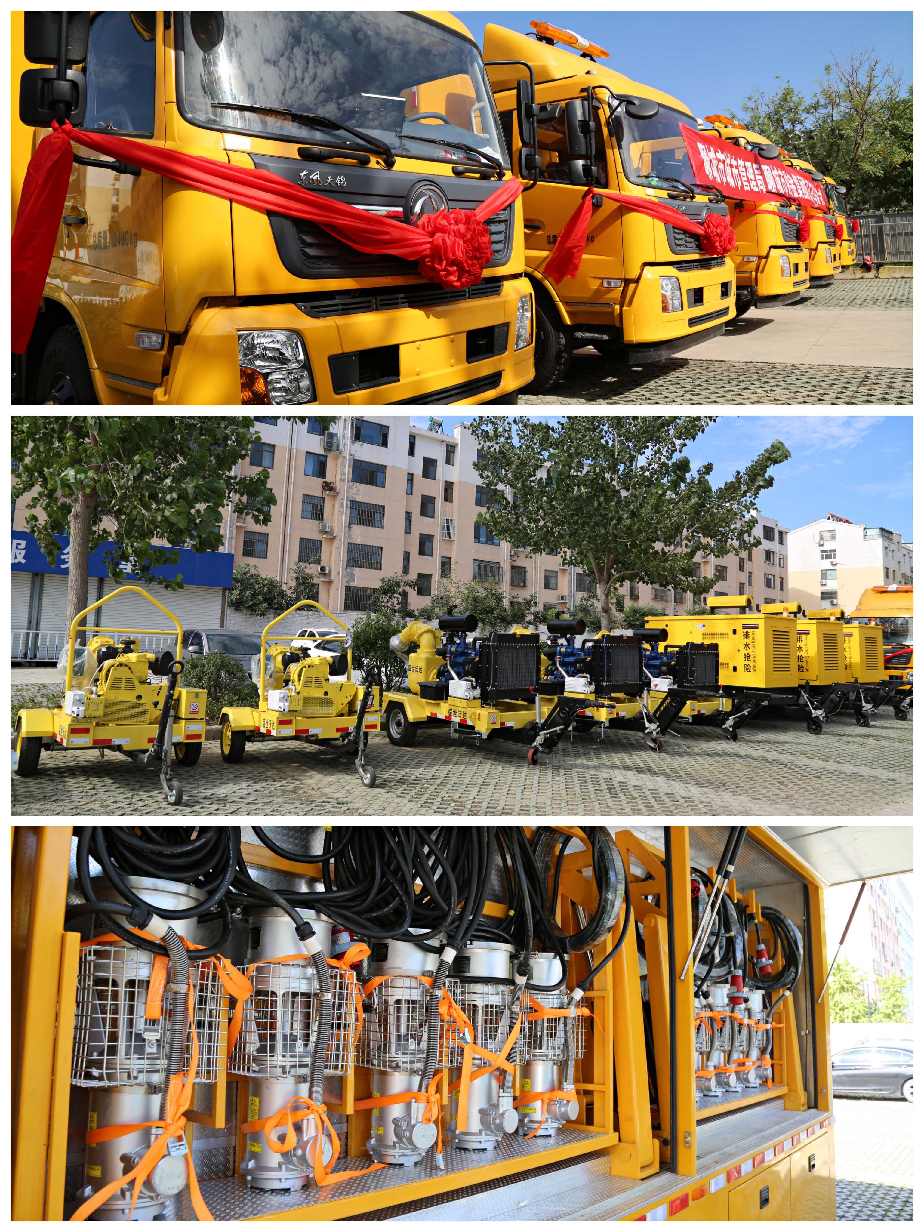 儀式現(xiàn)場,整齊排放著13輛各式各樣的防汛車輛,包括3輛5000m3/h排量、2輛3000m3/h排量的防汛強排車,3輛1000m3/h排量、3輛550m3/h排量、2輛360m3/h排量的拖掛式防汛強排泵,能夠滿足城區(qū)多種環(huán)境下的防汛工作。車輛廠商人員詳細介紹了車輛的基本情況,并進行了車輛內部展示。隨后,王躍將“車輛鑰匙”遞交到市城管局靖鵬程手中,宣告車輛正式交付使用。